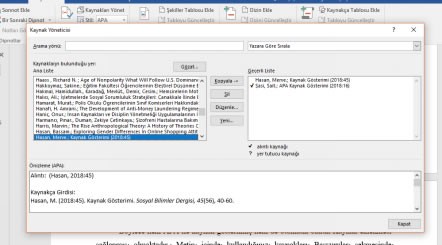 Tamam tıklanır. (Şasi, 2018:16) Kaynak, kaynakçaya otomatik eklenir. Alıntı ekleye tekrar tıklandığında bu kaynakların kaynaklar içinde olduğu görülür. Kaynak eklendiği yerde kutucuğa sağ tıklayıp alıntıyı güncelleştir ile değiştirilebileceği gibi Başvurular sekmesinde Kaynakları yönet kısmından da değiştirilebilir. Aynı kaynak tekrar kullanıldığında Alıntı Ekle kısmından kaynağa tıklamak yeterli olacaktır. Aynı kaynağın başka sayfasının kullanımı halinde kaynak metne eklendikten sonra, kaynak kutucuğunun yanındaki oka tıklayarak “Alıntıyı statik metne dönüştür” demek yeterli olacaktır. Statik metne dönüştürülen kaynağa yeni sayfa numarası yazılabilecektir (Şasi, 2018:21).